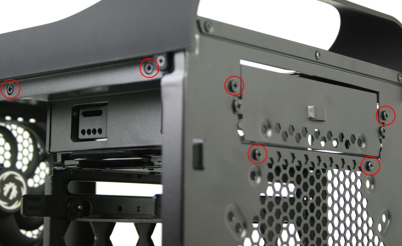 Starting at the top-front of the chassis, 5.25" devices are secured in place with standard screw mounting. Since we at Puget Systems ship computers nation-wide, we naturally dislike tool-less mounting and really like to see devices secured with screws whenever possible. Like we stated earlier in this article, this 5.25" bay will need to be removed in order to install a second 120mm front fan or to get full use out of the second top 120mm fan mount. To remove this bay, first remove the front bezel then unscrew the four screws around the front of the bay and the two screws to either side as shown in the middle picture above.