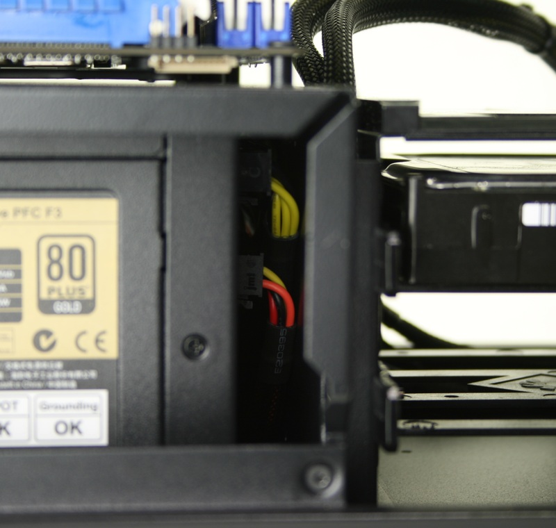 Since this is a mini-ITX chassis, we knew that there was going to be a few instances of things just barely fitting, but we came across a few that we did not expect. First, the power supply we used (a SeaSonic X-560) just barely fit inside the power supply cavity. We used a SeaSonic X-560 power supply so that we could test modular cables, and each of the modular cables had to be bent just right for us to be able to securely screw in the power supply. This PSU is about 6.25 inches deep so this goes to show that you absolutely cannot fit a power supply that is any longer than 6.25 inches. This is a bit of a letdown since this chassis is designed to support high-end video cards, but you will largely be limited to 650 watt, or an occasional 750 watt, power supplies.