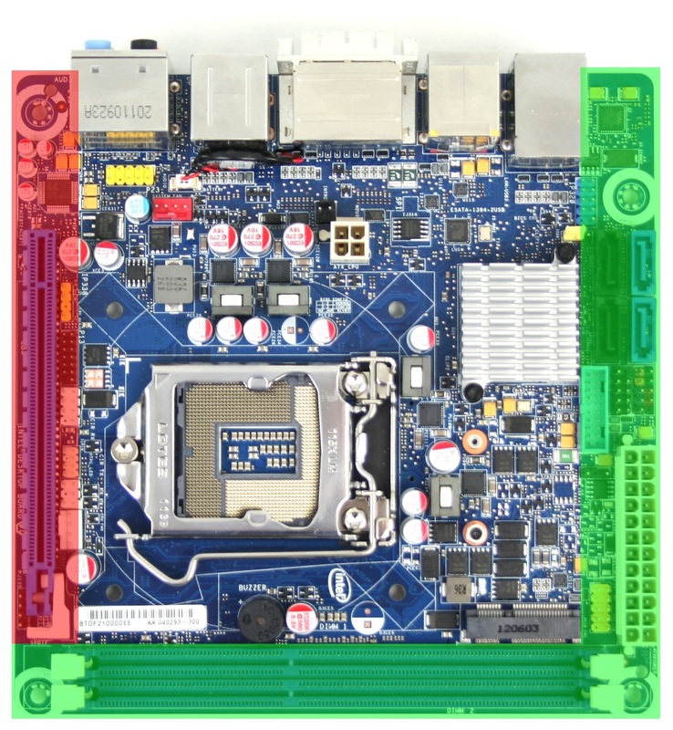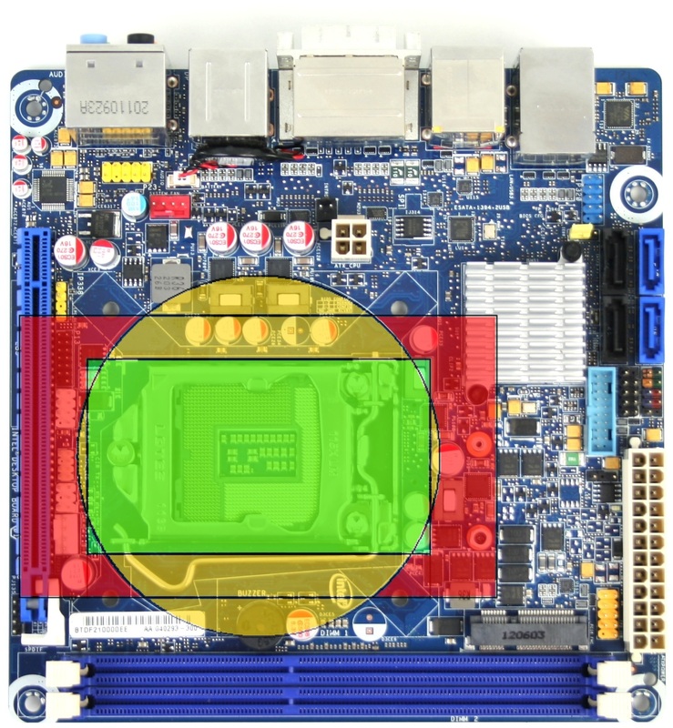 To show why you might not want to use a large heatsink, please refer to the image to the right. The yellow area is the space taken up by a Stock Intel 1155 CPU Cooler, while the green is the space taken by a Cooler Master Hyper TX3 CPU Cooler; both of which fit pretty well on this motherboard. The red area, however, is the size of a Gelid Tranquillo Rev2, which is one of the skinniest 120mm fan-compatible heatsink available. As you can see, even this relatively skinny heatsink completely covers the PCI-E slot on this motherboard. So while you can physically fit a large heatsink in this chassis, depending on the location of the CPU socket, you may lose the ability to install a PCI-E card.