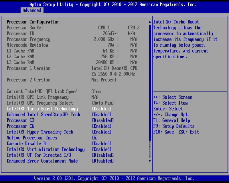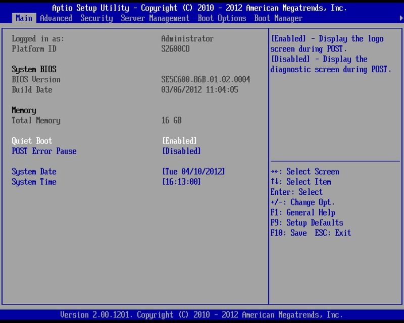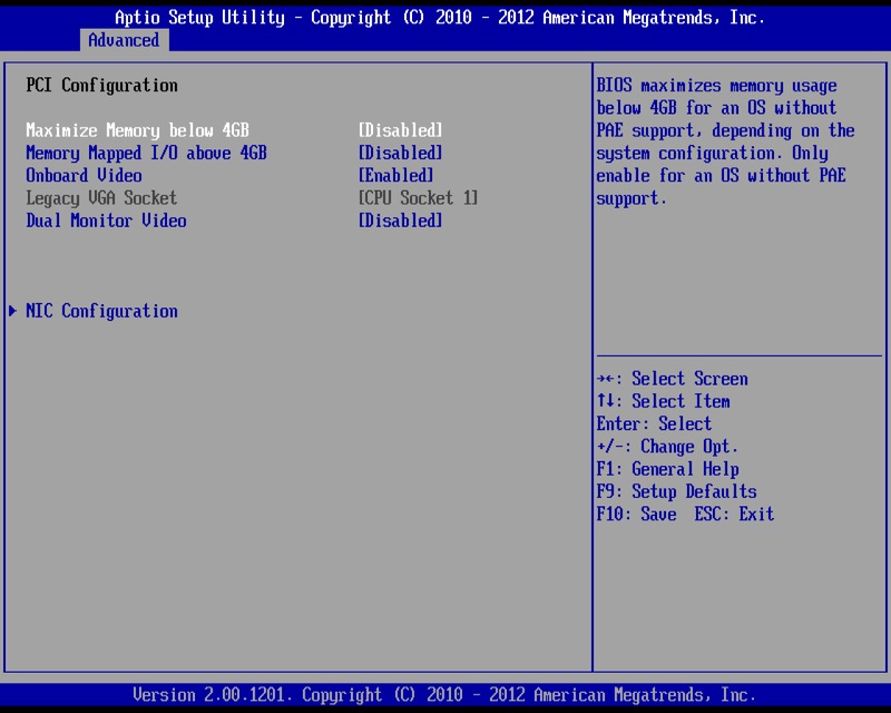 As is the norm on server motherboards, the BIOS options are fairly limited. The RAM configuration is very basic, allowing you to set the frequency, but not timings or voltage. Of the onboard devices, you can enable/disable the SATA controller, onboard video, LAN ports, serial ports, and the USB controller.