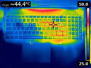 Under load, however, the laptop is too hot to use on your lap. The bottom surface measured over 50 degrees Celsius, maxing out at 58.7 degrees Celsius; you will want to keep the mobile workstation on a flat surface like a table or desk. The top surface, with the keyboard and trackpad, is also warm. In our testing, we never found it to reach a temperature where it was uncomfortable to use—the trackpad always stayed cool, and the keycaps never went above 40 degrees Celsius. This makes them warm, but not hot. There are some other hotspots near the top of the laptop, but overall, the new 16″ model stays cooler on the typing surface than the last-gen 17″.