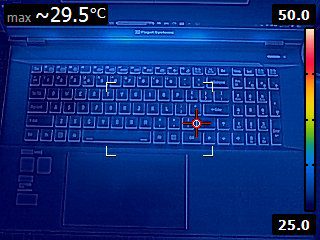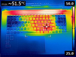 While under maximum load, the Puget Mobile 17″ reaches temperatures that would be problematic to use on your lap (Image 4) and potentially uncomfortable for extended use on the upper surface (Image 3). Anecdotally, the typing and touchpad surfaces themselves were never uncomfortable to touch, but areas around them (specifically, right next to the screen) could be, and higher temperatures become more problematic the longer you use the machine.