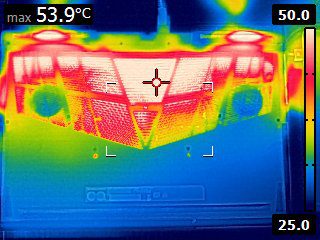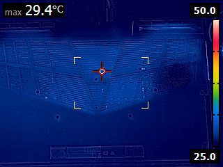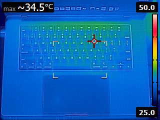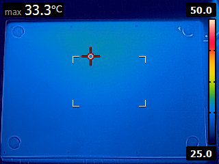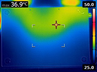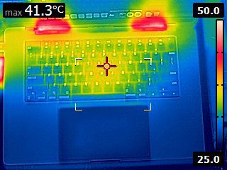 In contrast, the MacBook manages to always stay under 42 degrees Celsius on the typing surface (Image 4) and under 40 degrees Celsius on the bottom (Image 3). This makes it acceptable for extended lap use under load; at worst, it could be a bit uncomfortable for long typing use, but for most users, it will be just a bit warm to the touch.