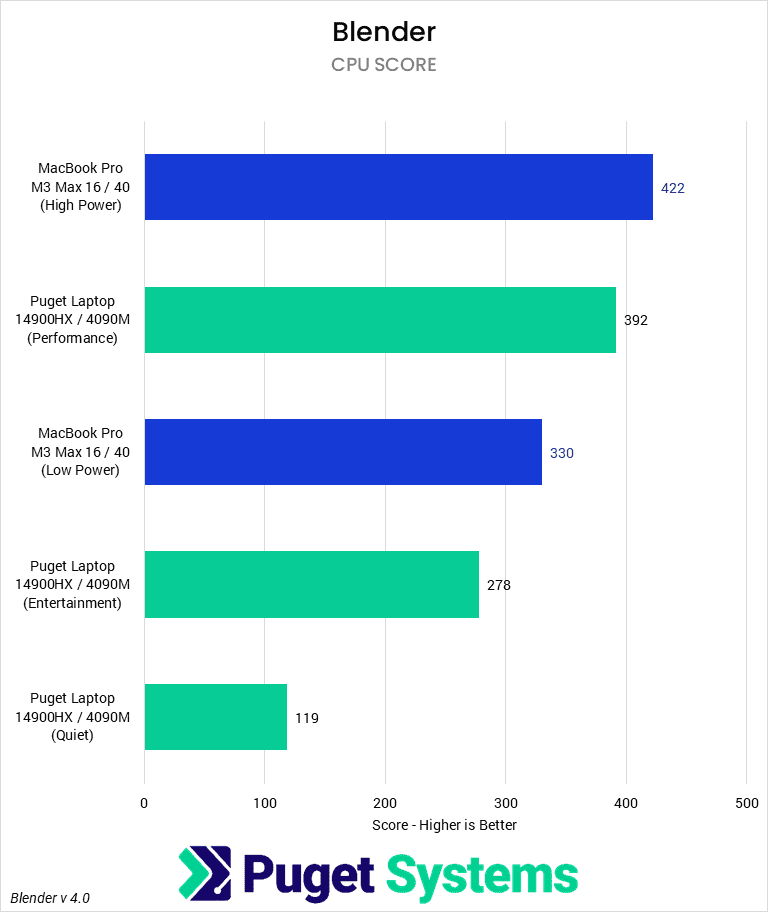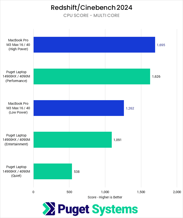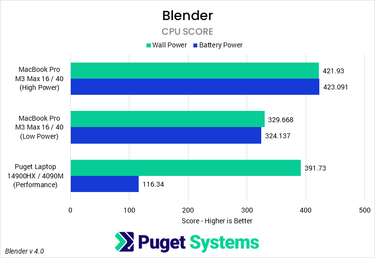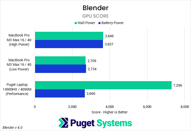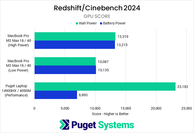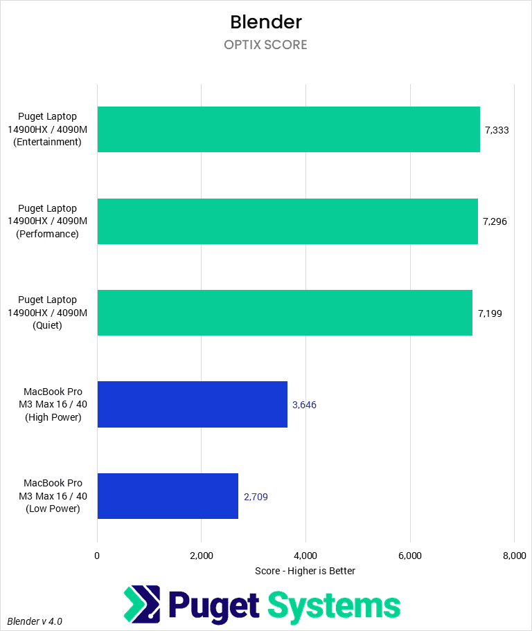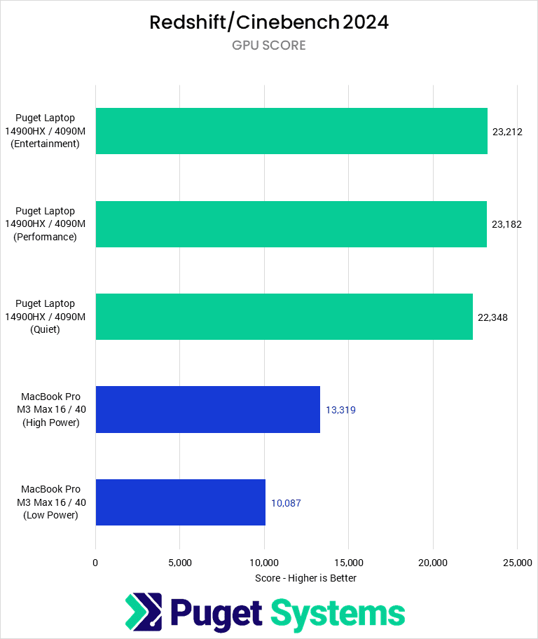 While the Apple lags behind the RTX 4090 laptop GPU, it is interesting that it virtually ties AMD’s 7900 XT desktop GPU (not shown in the charts above). When it comes to GPU rendering, an NVIDIA GPU is the only way to go, whether it is for a laptop or desktop.