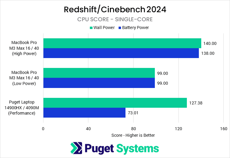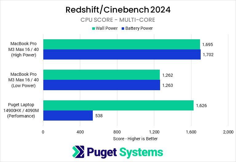 Unfortunately, Apple does not publish their power targets between their High Power and Low Power modes, so we cannot list them here. However, the custom chips that Apple uses are famously efficient. We tested both power modes on battery and wall power. We will also have a future article on the battery life and thermals of the Puget Mobile 17″ and will also use the MacBook Pro to compare. If you want more in-depth numbers, there are a number of good reviews of the M3 Max MacBook Pro you can find online that report power usage in various tasks.
