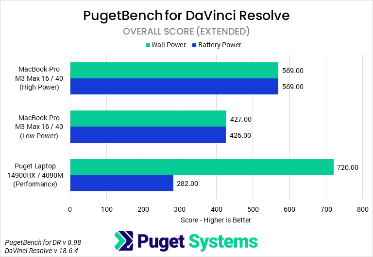 This means that outside of the most extreme situations (like AI features in DaVinci Resolve), all of the areas where the PC laptop is faster than the MacBook Pro when plugged in disappear if you have to run on battery power. This is one of the reasons why we specifically call our laptop a “Mobile Workstation” first and foremost, as it should be considered a system that is easy to move around but should be plugged in whenever possible.