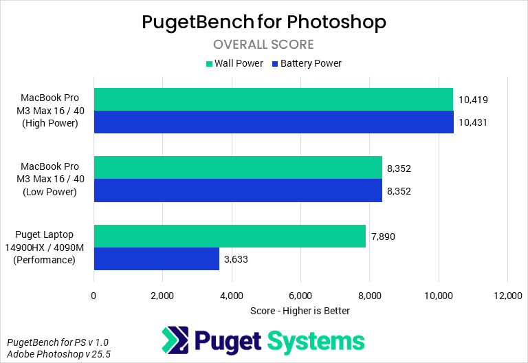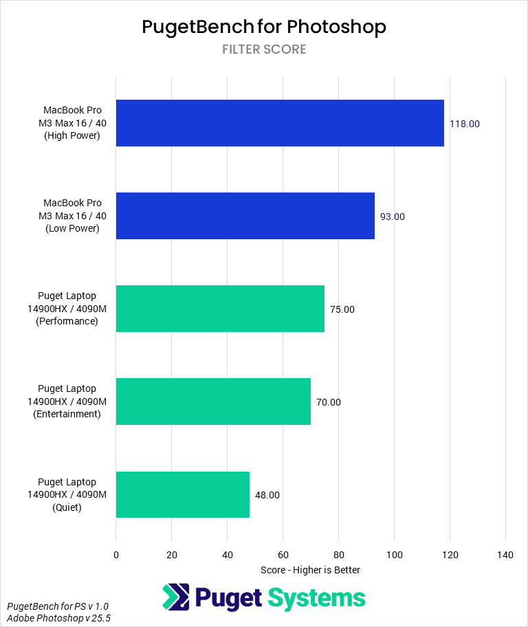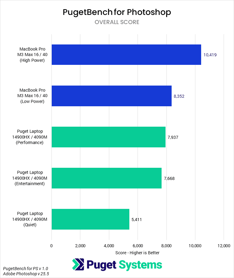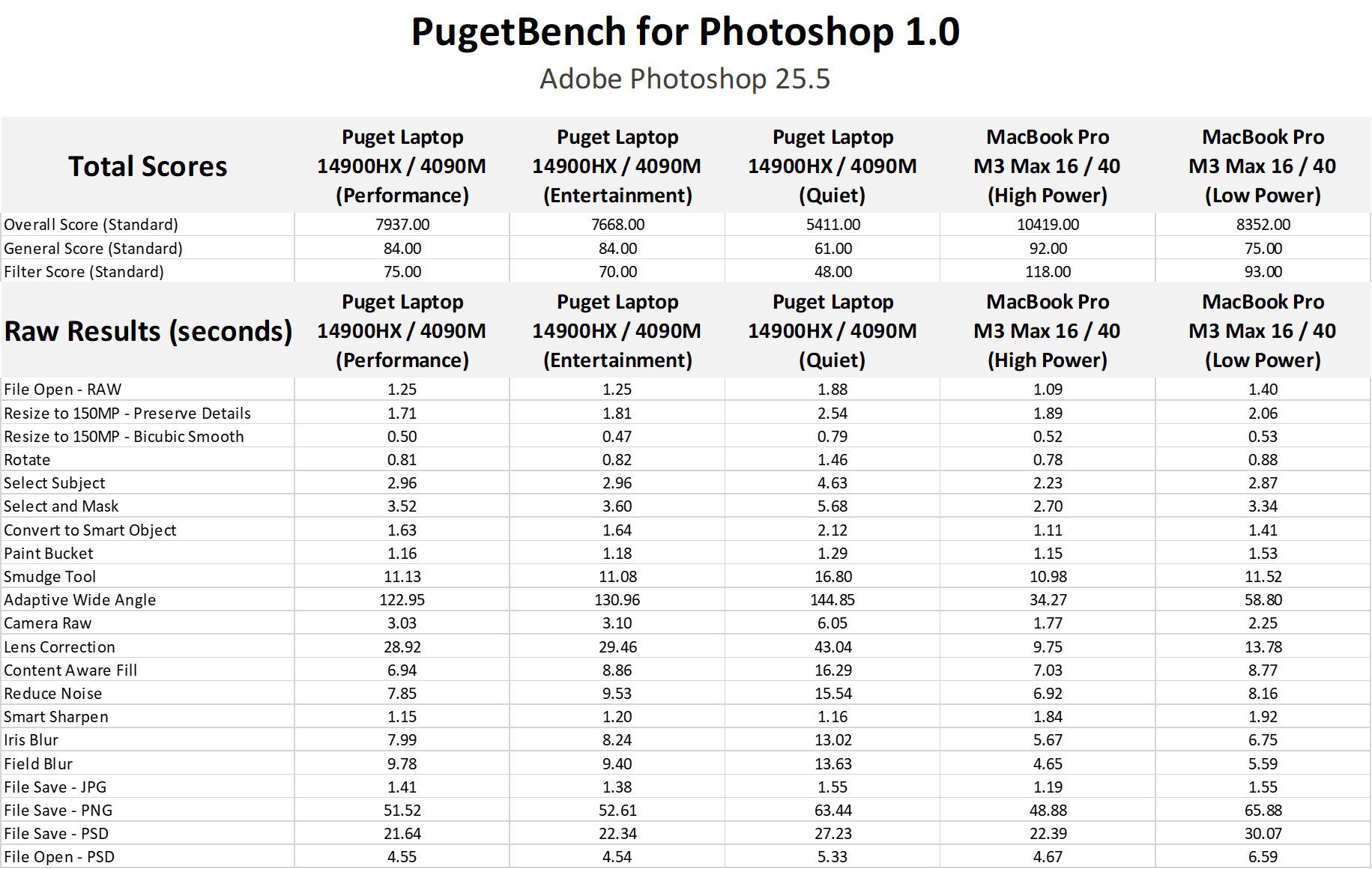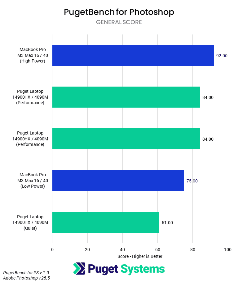 Starting off with Adobe Photoshop, we want to mention again that most of our performance analysis is going to be based on when the Puget laptop and MacBook Pro are plugged into the wall. We have a whole section dedicated to the performance on battery power, but the short of it is that if you want to have high performance, you very much want to be plugged in with any high-performance PC laptop.