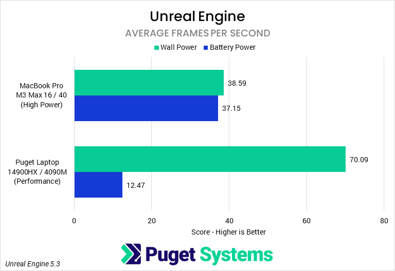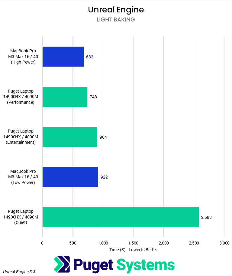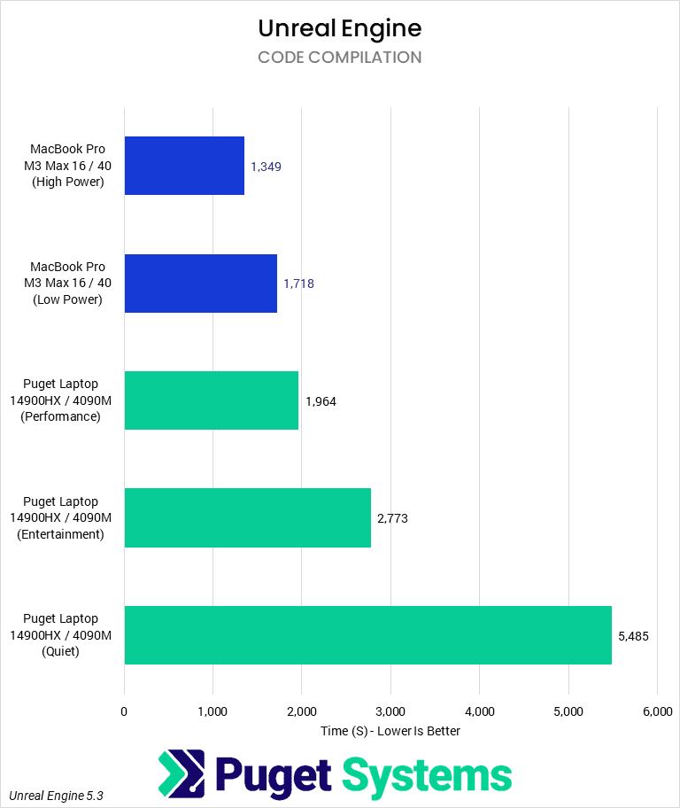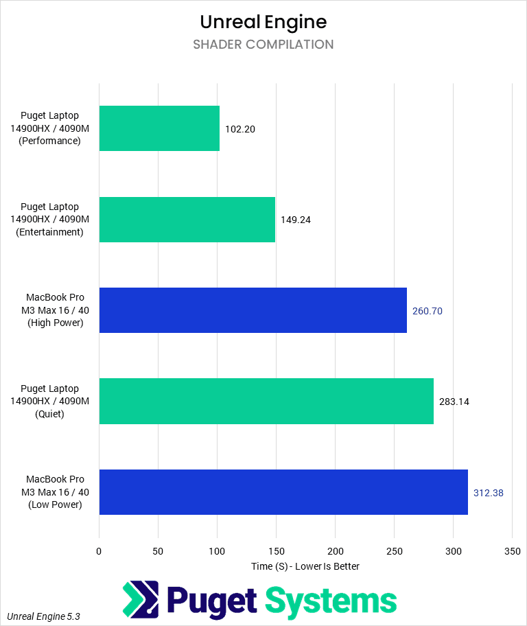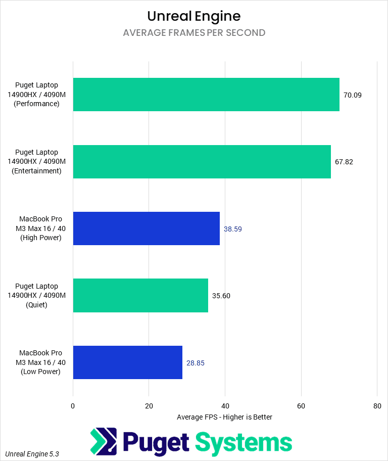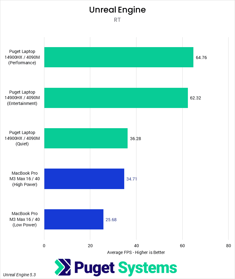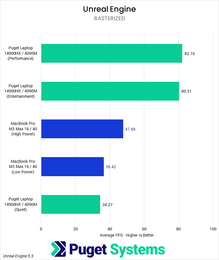 Unreal Engine is also faster on the PC laptop although, beyond just pure performance, overall support for Unreal on MacOS is fairly problematic at the moment. So, going with PC over Mac for this type of workload is essentially a given, regardless of the performance advantages to be had on PC.