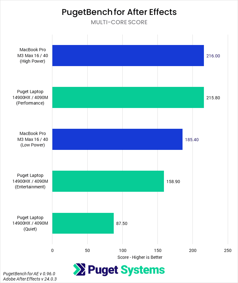 Getting back to the results for After Effects, with the highest power profiles, the MacBook Pro scores about 30% faster overall compared to our laptop. However, for very heavy projects where Multi-Frame Rendering comes more into play (chart #2), the MacBook and PC laptop score exactly the same. In other words, while most users will see a decent performance advantage by going with Apple, if you are regularly working with very complex projects that process at only a few FPS on even the fastest system available, these two mobile platforms will perform roughly the same.