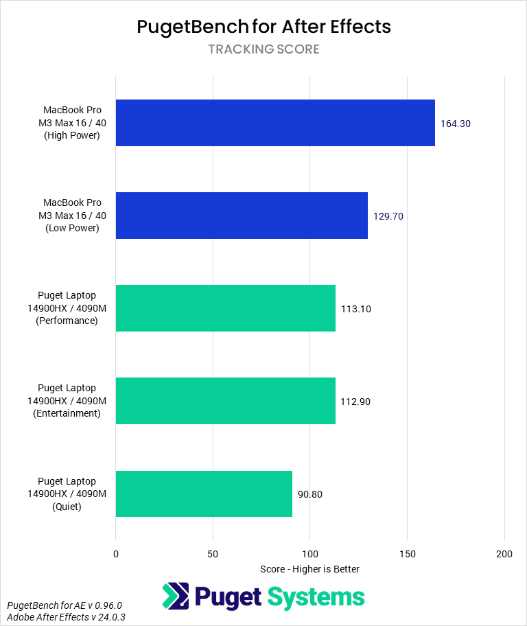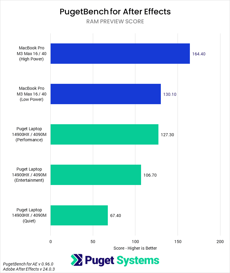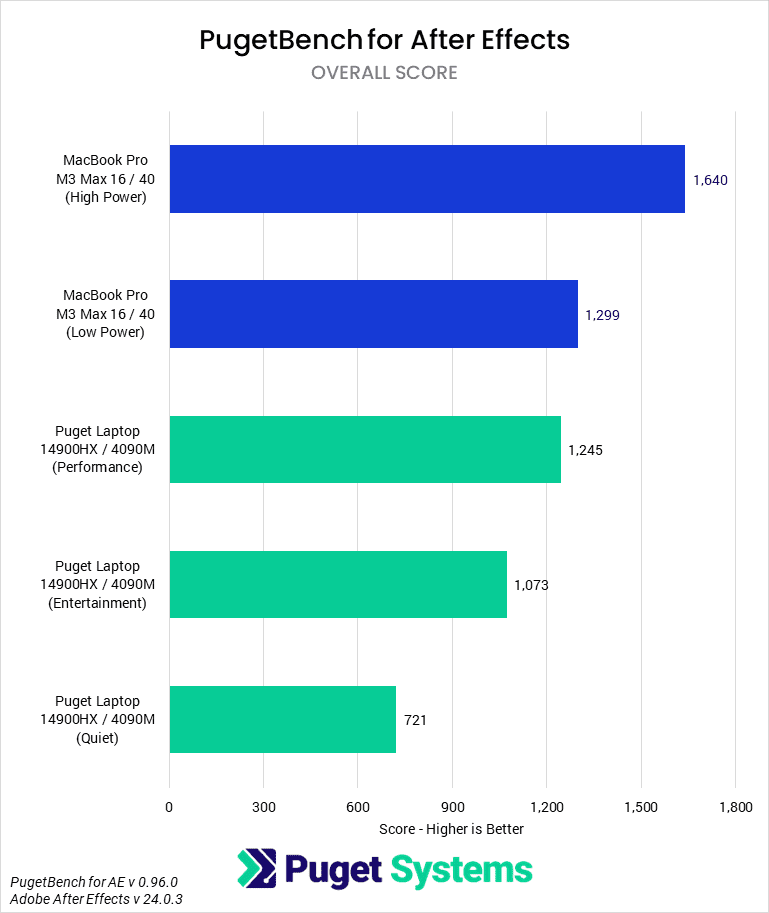 There are a few specific areas where the Puget laptop does well if you break it down on an individual test level – namely expressions and C4D integrated projects. But in general, Apple has a solid performance lead in After Effects.