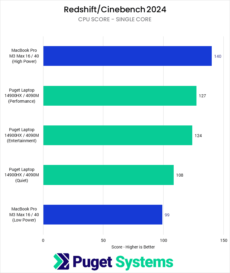 While the performance changes a bit based on the power profile that is being used on both units, we want to mostly focus on the highest power profiles – High Power for the MacBook and Performance for the Puget laptop. Feel free to compare the others yourself, but if you are trying to get work done, those are the profiles the majority of users are likely to use.