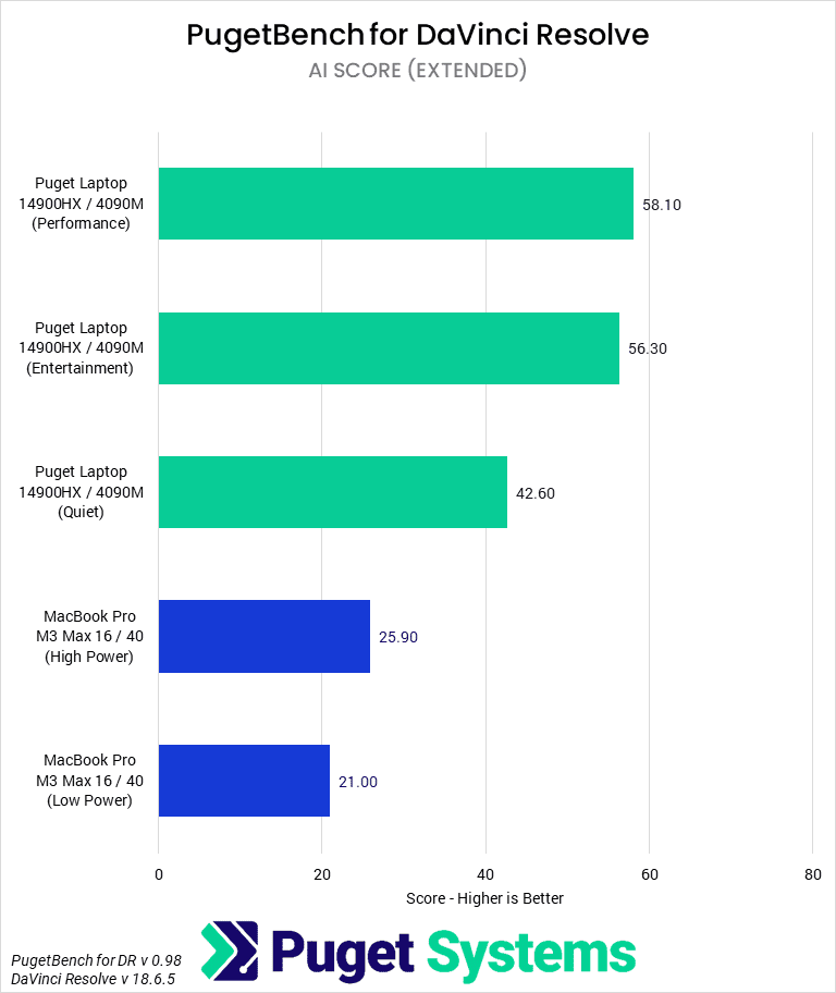 Overall, DaVinci Resolve Studio is one application where our PC laptop shines compared to the MacBook Pro. The overall performance difference works out to about 30% in favor of the laptop, but there are certain areas like the new AI features where PC has an absolutely massive advantage of up to 4x the performance.
