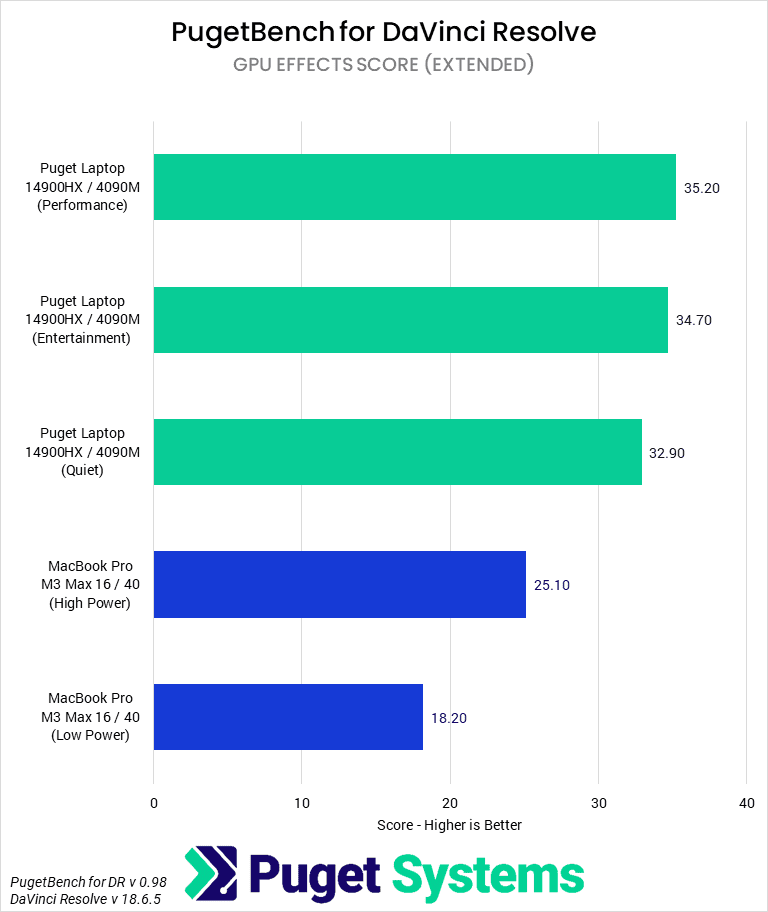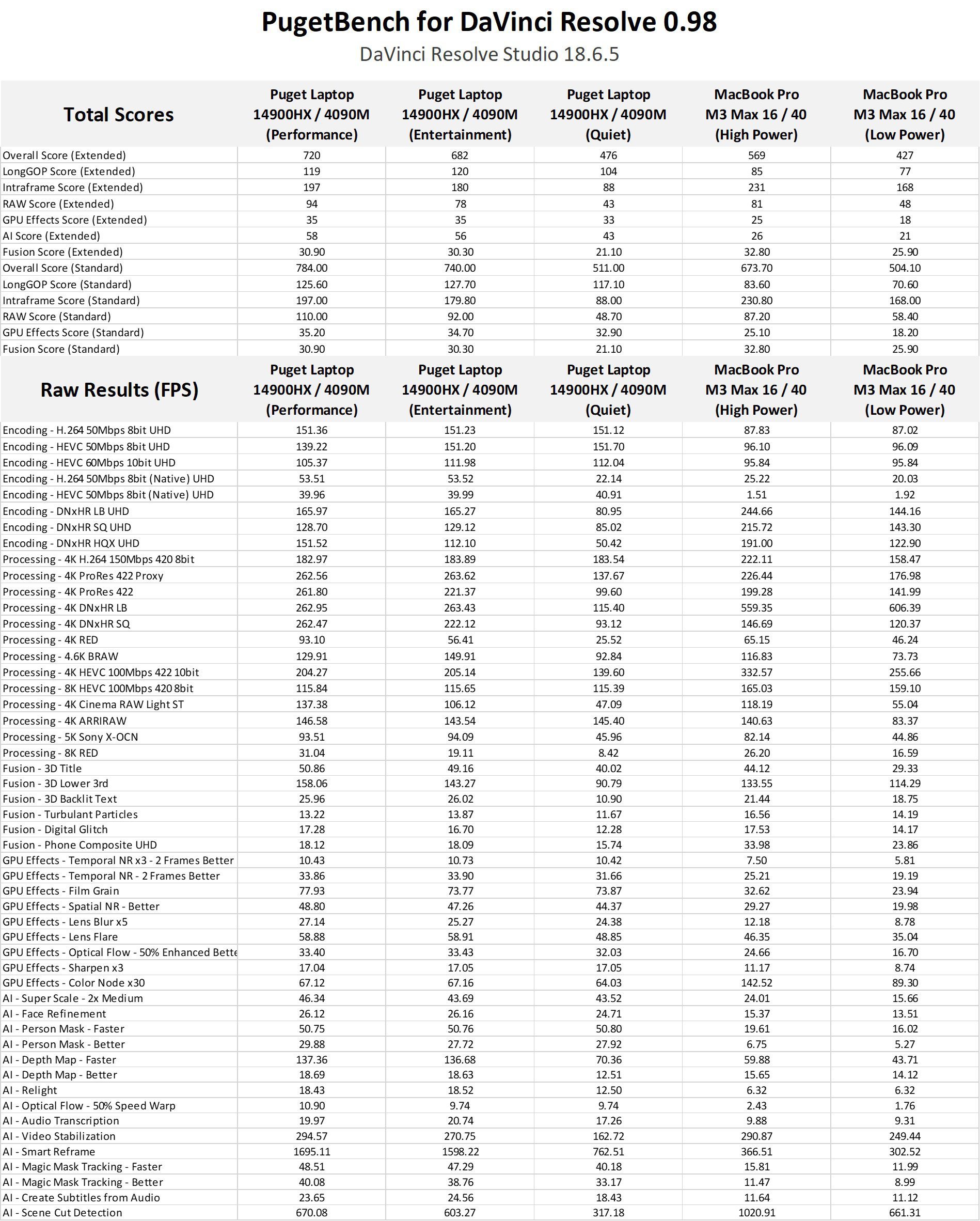 Overall, our PC laptop is about 30% faster than the MacBook Pro with both units in the highest performance profiles. But, like Premiere Pro, there are a number of nuances here, so we will again break it down by strengths of the laptop and MacBook Pro: