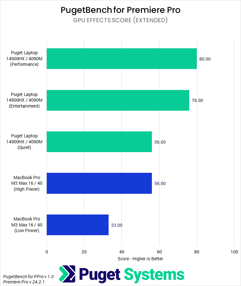 Lastly, processing GPU-accelerated Effects is around 1.4x as fast on our laptop. This isn’t typically as critical as it is in other applications like DaVinci Resolve, but if you regularly use these types of effects, that 40% performance bump can make a big difference.