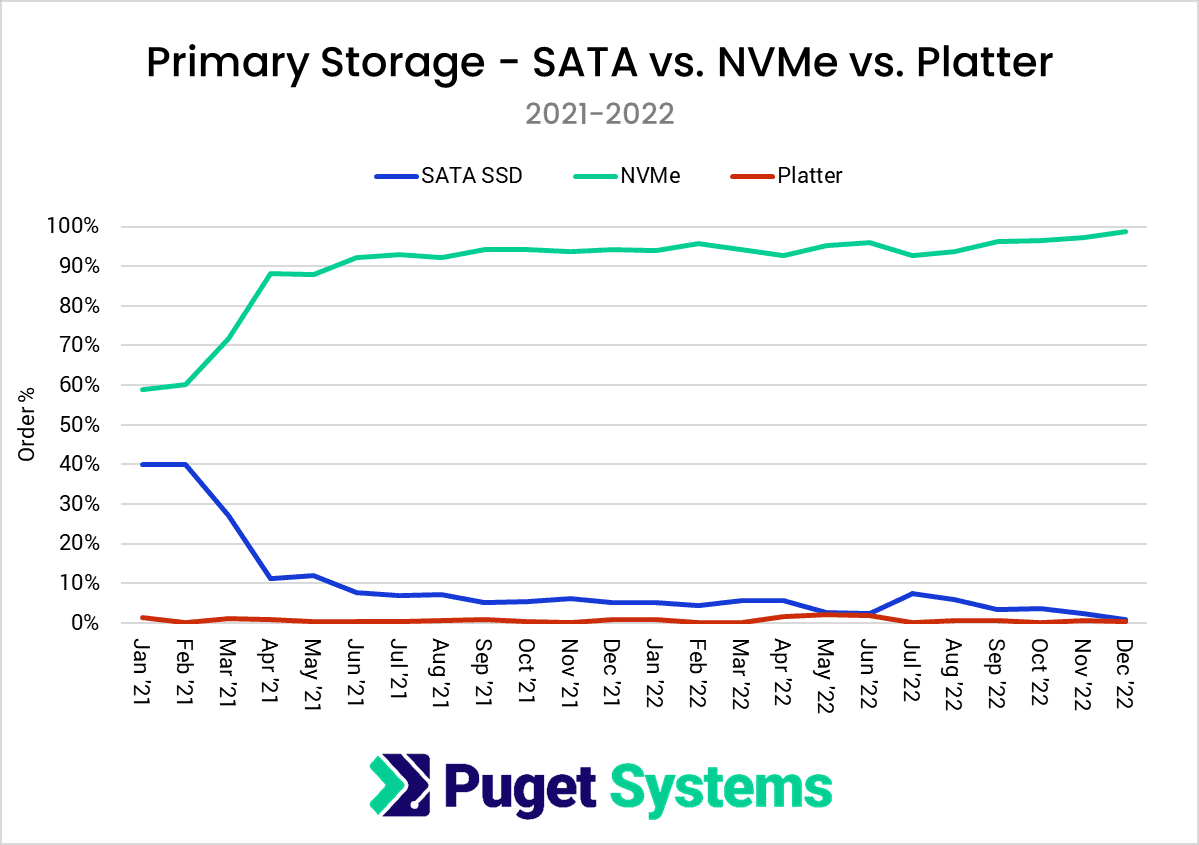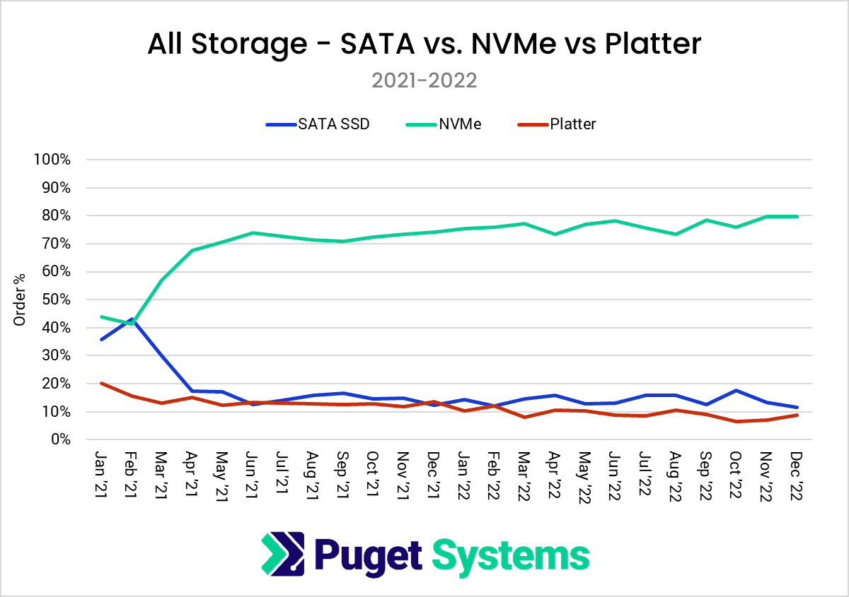 Switching to overall drive usage, NVMe drives are still the dominant option, but SATA SSD and platter drives are managing to hang on. We ended 2022 with SATA SSD and platter drives only making up about 10% of our total drive sales each, which is only slightly down from where we started the year.