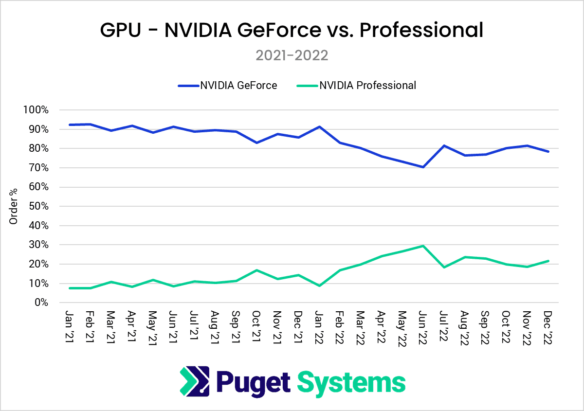 Once again, we are going to include data going back to January of 2021 to provide some additional context. Overall, the big trend is that we are seeing a growing market share for professional GPUs over the last few years, and it accelerated a bit in 2022. Where GeForce used to be over 90% of our GPU sales, we ended 2022 at only 80%.