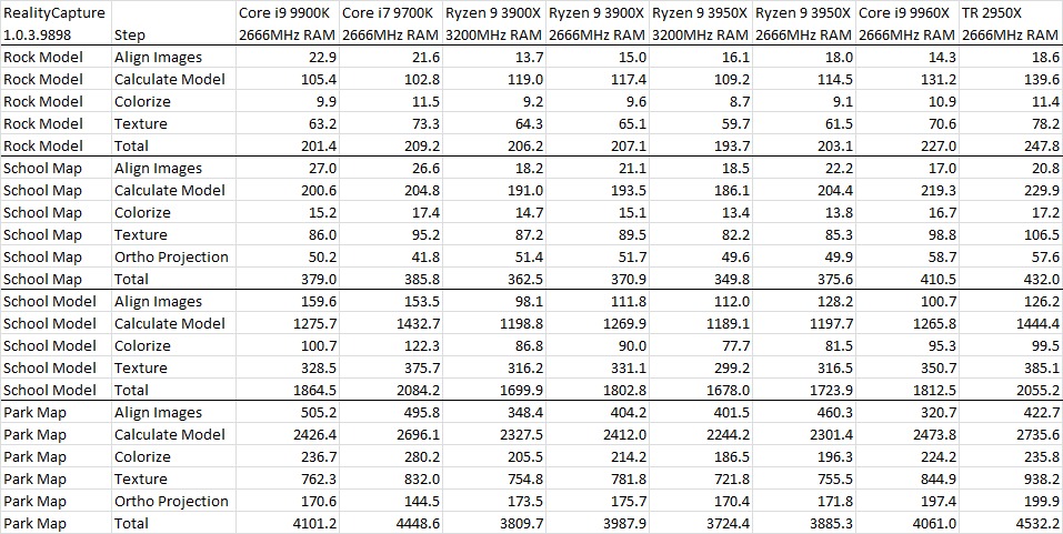 For those who want to dig further into the differences in how each CPU performed, here is a table showing the times for each step within RealityCapture on each of the image sets: