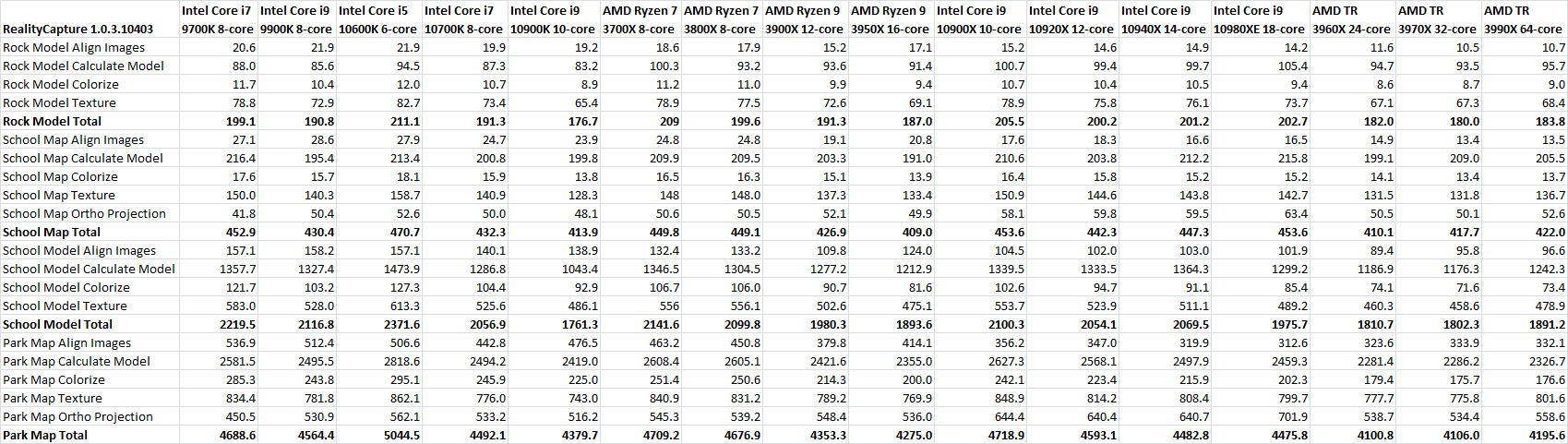 For this article, we are looking at how the new Intel 10th Gen Core processors compare to other currently-available models and the preceding 9th-gen Core series. The focus is on photogrammetry processing in RealityCapture, for which we have developed internal benchmarks here in our lab. More info about those tools and how we use them are available in the Test Methodology section.