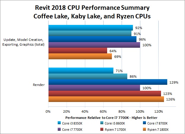 Just going off specs, it seems like the Ryzen chips are scoring lower than I would expect them to… so there may be some underlying optimization within Revit that benefits the 7700K and not AMD's models. It is possible that the new Coffee Lake chips are similarly affected, but the only way we will know for sure is if performance changes substantially in future versions of Revit.