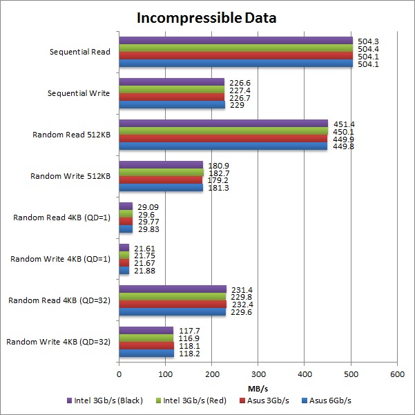 To compare the performance of each cable, we configured our test SSD as a secondary storage drive and ran CrystalDiskMark with each cable. We will be testing using both compressible (All 0x00) and incompressible (Random) data. We recently benchmarked the performance difference between these two types of data in our SSDs: Advertised vs. Actual Performance article, and the difference is large enough that we feel it necessary to use both types of data in our testing.