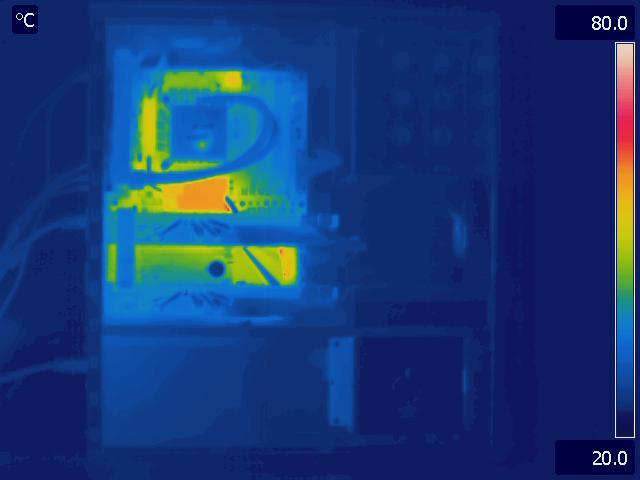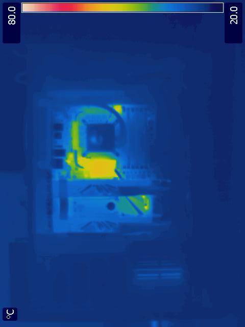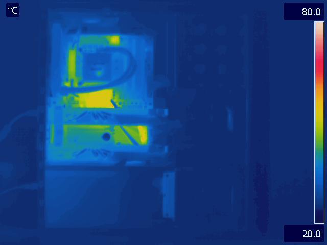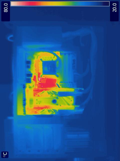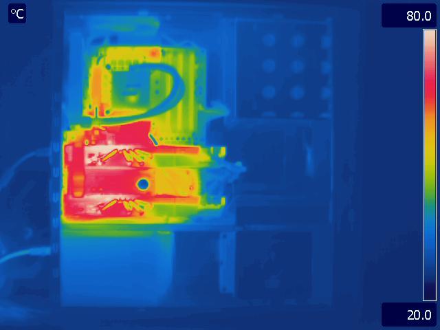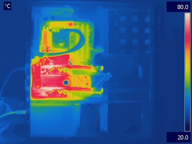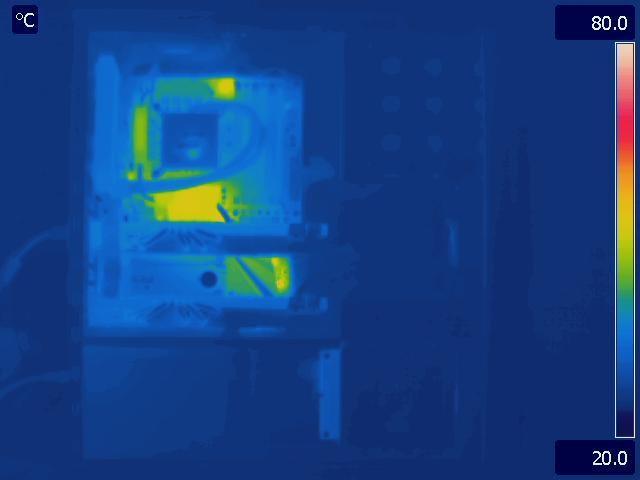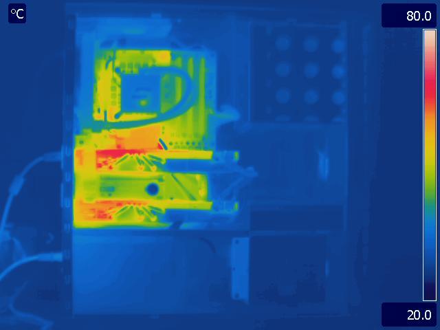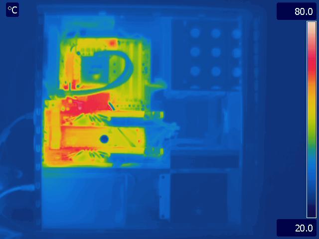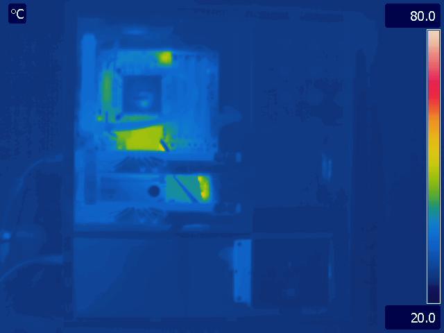 The thermal images clearly show the benefits of a side fan, with the hotspots on the motherboard being much smaller when it is included. With the system at load, the white-hot heatsinks on the video cards are replaced with much better looking orange and red readings. The image is close to our benchmark FT02B-W thermal image, but still has a bit to go to match it.