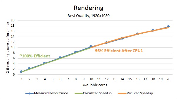 While the pre-pass results were very good, the final render is even better. We actually saw perfect scaling for the first CPU (which does not happen very often) and while we still saw a drop with the second CPU the multi core efficiency stayed at a very impressive 96%