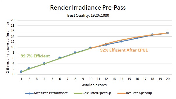 Starting with the irradiance pre-pass we see some very impressive results. For the first CPU we saw a 99.7% multi-core efficiency which is extremely good. The efficiency did drop to 92% for the second CPU, but even that is fairly decent.