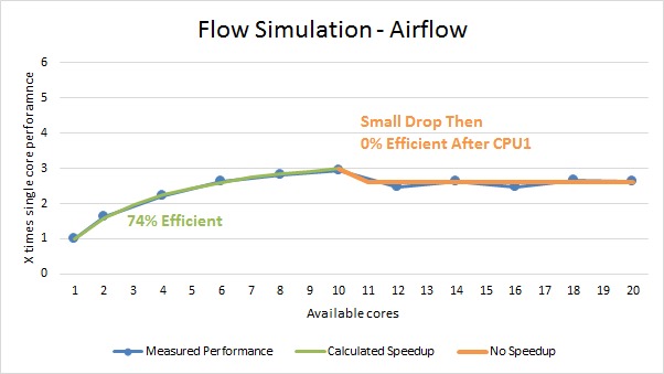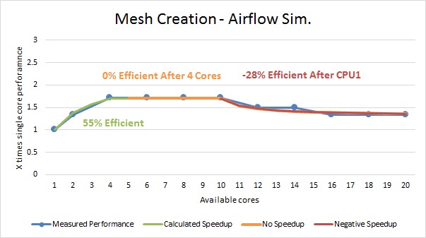 Creating a mesh for our airflow simulation model was very interesting. We saw a small 55% multi-core efficiency for the first 4 cores, then no increase for the remainder of the first CPU. When we started using the second CPU, we saw a small but steady -28% efficiency.