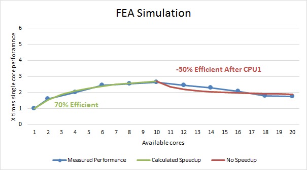 Starting with FEA simulation, our results are not very encouraging. For the first CPU, we saw a very poor 70% efficiency which means that in most cases having a high frequency 4-6 core CPU is going to be much better than a higher core count, lower frequency CPU. In fact, we actually saw a steady drop in performance as we utilized the second CPU. In other words, for FEA simulation you can get some benefit from having more cores, but you should strongly avoid dual Xeon systems.