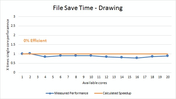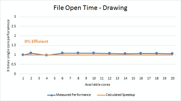 1) Opening and saving files (both assembly and drawings) is multi-threaded, but is limited to the point that there is no actual benefit to having more than a single CPU core. Simply put, something else (whether it is hardware or software) is the bottleneck in our test system, not the CPU. Considering that the CPU we tested with only has an operating frequency of 3.1GHz and we are using a fast SSD storage drive, we can fairly confidently state that unless you have a very low-end CPU your processor is not going to be the limiting factor when it comes to opening and saving files.