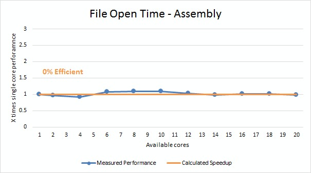 To start things off, we are going to look at something every Solidworks user does multiple times a day: opening and saving files. We tested how long it took to open and save both assembly and drawing files using between a single CPU core and 20 CPU cores: