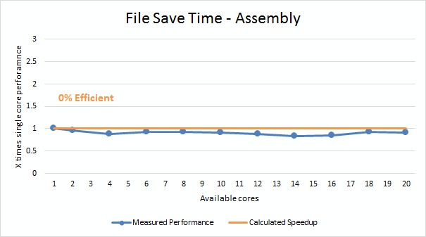 Keep in mind that we are using a very fast (>500MB/s) SSD in our test system so even if the drive is the bottleneck (which our storage testing has shown should only possibly be the case for the assembly save benchmark) you would need a much, much faster drive to start to see the benefit from having more than 2-4 CPU cores.