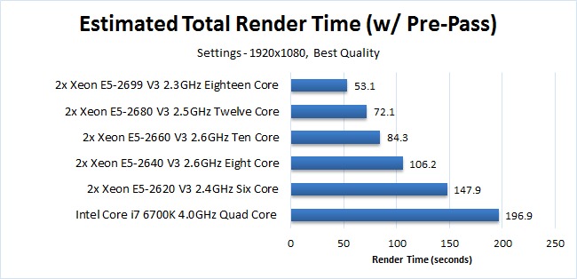 In the case of a dedicated rendering machine there are a lot of good CPU choices but based on the efficiency we measured a dual Xeon system should give you the best performance for your money. To give you an idea of how much better performance you can expect compared to an Intel Core i7 6700K, the chart below should be an accurate estimation of how long it would take to render the image used in this article with the dual Xeon CPUs we would recommend: