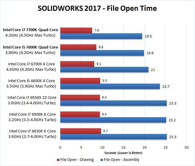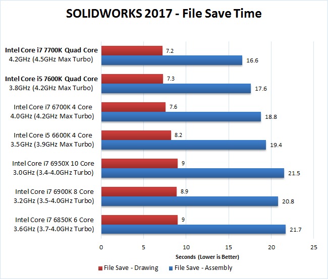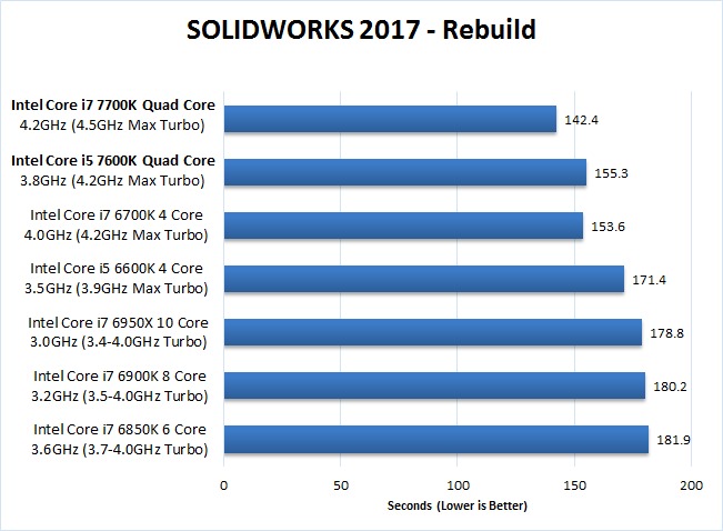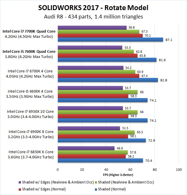 For the general modeling tasks we tested (including opening/saving files, rebuilding an assembly, motion study, and rotating a complex model), the difference in performance across the various CPUs was very consistent. On average, we saw about a 7% increase in performance with the new Intel Core i7 7700K compared to the old Core i7 6700K which exactly matches the 7% difference in the maximum Turbo Boost frequency between the two CPUs.
