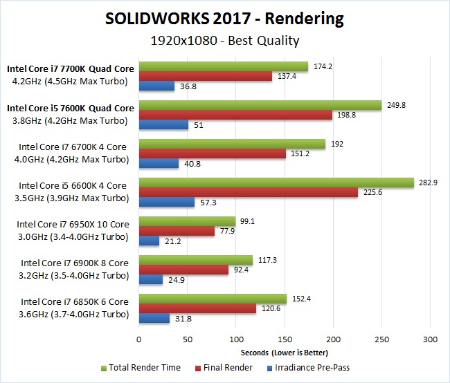 Once again, however, the i7 7700K is not the best CPU for rendering in SOLIDWORKS. If you do a lot of rendering, the 6 core i7 6850K is about 14% faster than the i7 7700K, the 8 Core i7 6900K is about 50% faster, and the 10 core i7 6950X is about 75% faster.