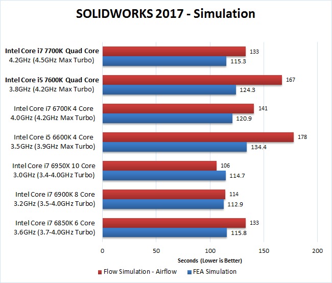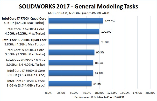Overall, the new Core i7 7700K is about 7% faster than the old Core i7 6700K for general modeling tasks, 5.4% faster for simulations, and 10% faster for rendering. This isn't a huge increase in performance, but it is enough to be noticeable in many situations. The Core i5 7600K, on the other hand, is only a bit slower than the i7 6700K for general modeling tasks (less than 1%), but is about 9% slower for simulations and 23% slower for rendering.