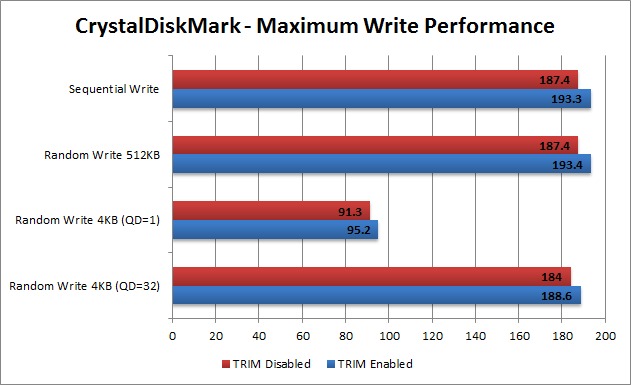 Frankly, we expected TRIM to do a bit more than what our results show. It definitely makes a difference, but only by about 2-4%. We see no reason to turn it off, but at the same time it doesn't appear to be critically important; at least on the model of SSD we used for testing. Solid state drives have come a long way since TRIM was introduced, so we wouldn't be surprised if there was some other unknown type of garbage collecting going on with this drive that was based solely on the controller. Unfortunately, that type of information is usually very confidential and is not something we are likely to be able to test anytime soon.