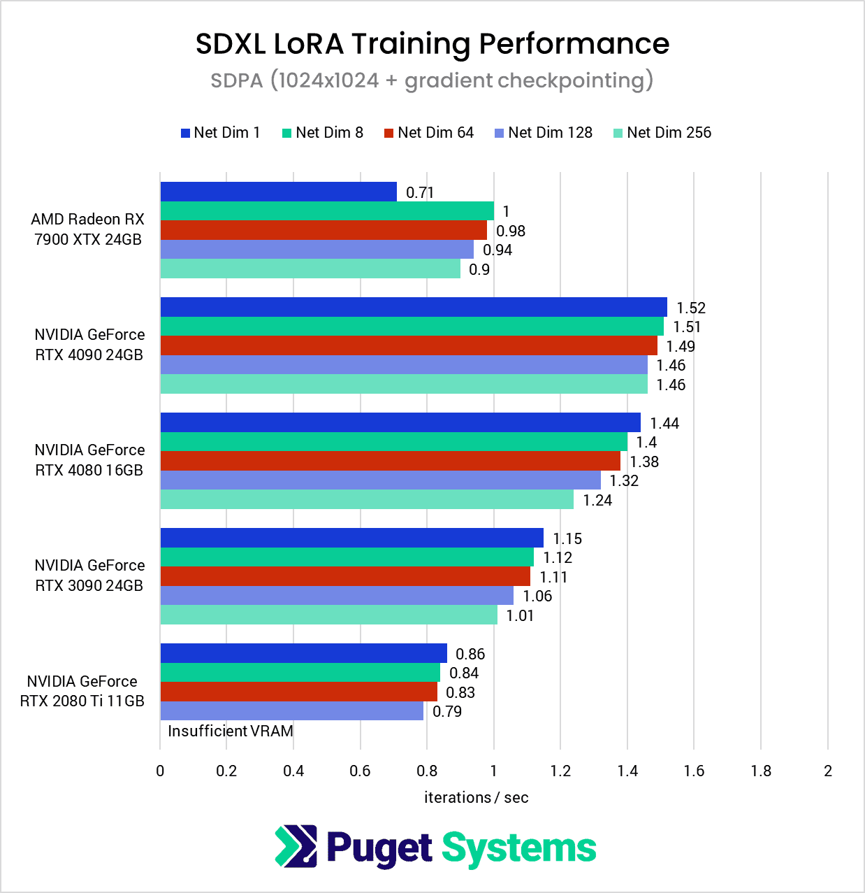 Despite that, the gradient checkpointing option reduces VRAM usage to the point where even 10-12GB cards can be used for LoRA training with a range of network dimensions and dataset resolutions. However, GPUs featuring 24GB of VRAM will offer the most flexibility for training parameters, and Ada-generation GPUs from NVIDIA continue to outperform the competition for this type of workload.