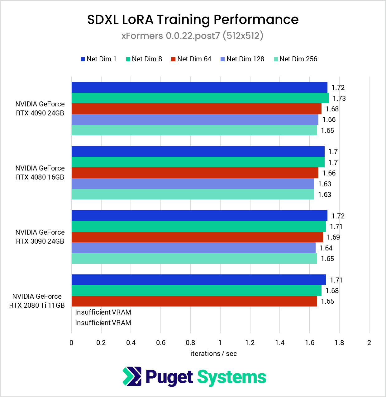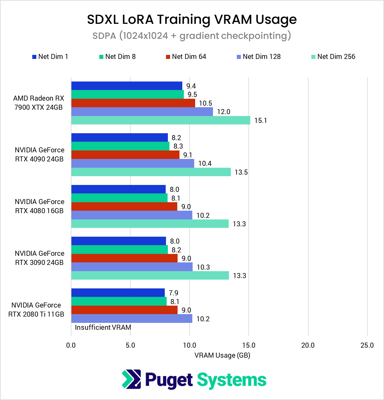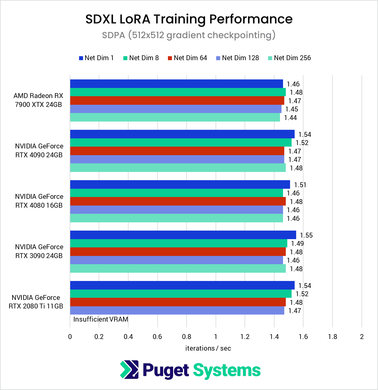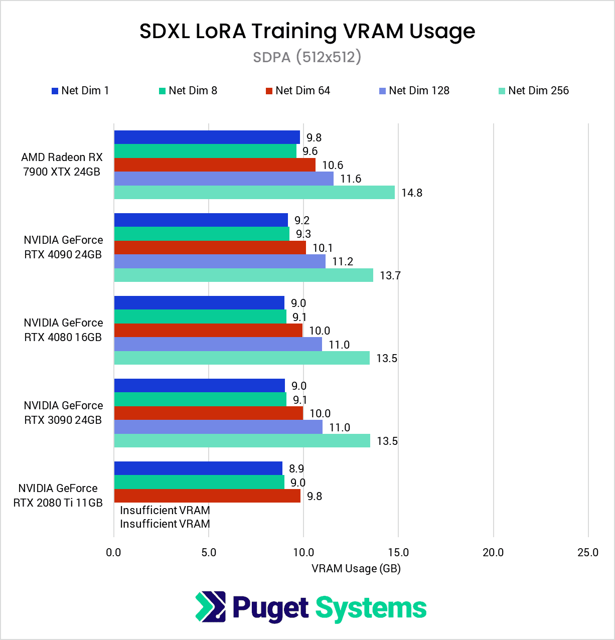 Compared to 1024×1024, the VRAM requirements for the 512×512 dataset are quite modest, generally dropping between ~40-50%. This is enough of a reduction that all of the GPUs except for the RTX 2080 Ti were able to complete the test suite without the use of gradient checkpointing.
