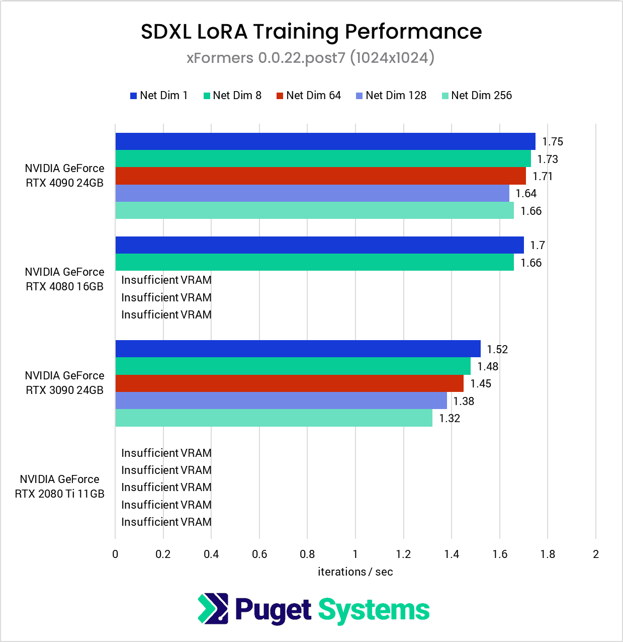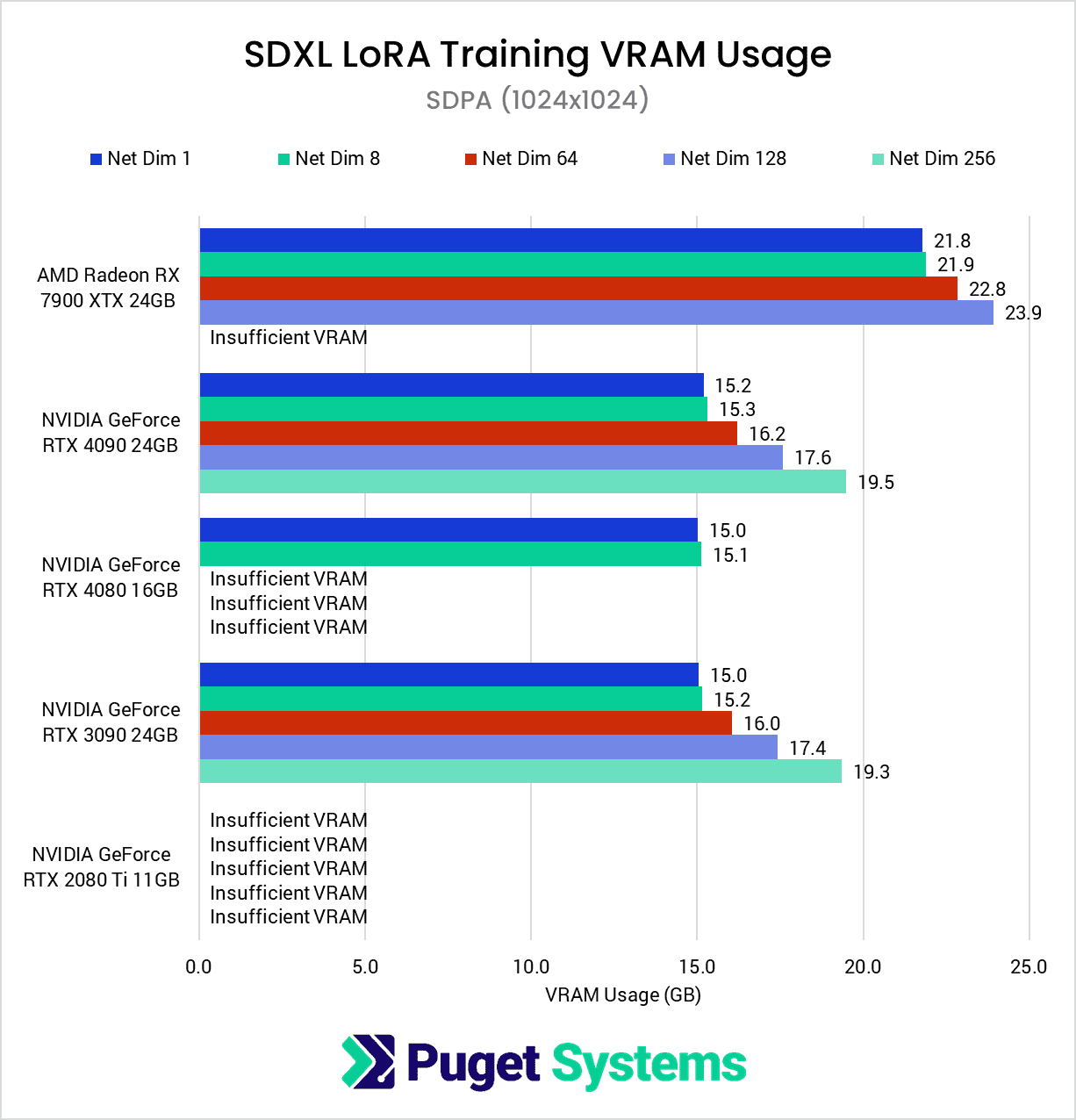 These results show that consumer-grade GPUs are capable of training LoRas, especially when working with smaller resolutions like 512×512, which is the default for SD1.5. However, when training using higher-resolution images, such as 1024×1024 for SDXL, we quickly begin to run into VRAM limitations on GPUs with less than 24GB of VRAM.
