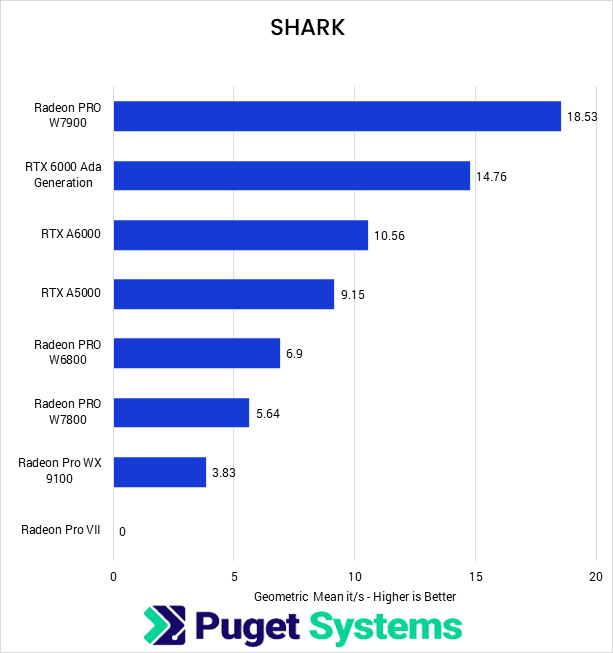 Moving on to SHARK, we see why AMD users tend to favor this implementation. The Radeon PRO W7900 has the highest results of all the cards we tested, followed by the NVIDIA suite in its expected order. Interestingly, the Radeon PRO W6800 had results nearly 20% higher than its new replacement, the W7800–it seems likely this is a bug, but we are unsure if it is with the implementation or our testing. The Radeon Pro VII did not complete testing with the SHARK implementation, likely due to it lacking some newer features that are required by this package.