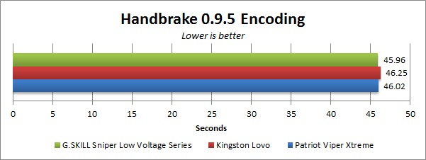 After running our full gambit of benchmarks, we can say pretty conclusively that low voltage RAM performs exactly the same as standard voltage RAM. But since leaving it at that would make this section awfully short, let's take a look at a small sample of the benchmarks we performed: