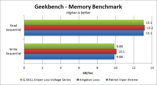 Geekbench is a processor and memory benchmarking utility that is one of the more recent additions to our benchmarking lineup. The sequential read and write portion is just one of many tests, but it accurately reflects the overall results. Although the Kingston Lovo is technically to top performer, the results are all well within our margin of error indicating that all three of our test models are effectively identical for this benchmark.