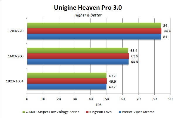 Unigine Heaven Pro 3.0 is a DirectX 11 benchmark that we ran with 8x AA and 16x AF to try to accentuate any performance variance. Unsurprisingly at this point, the results are all within our margin of error with less than a .5 FPS difference between the highest and lowest results.