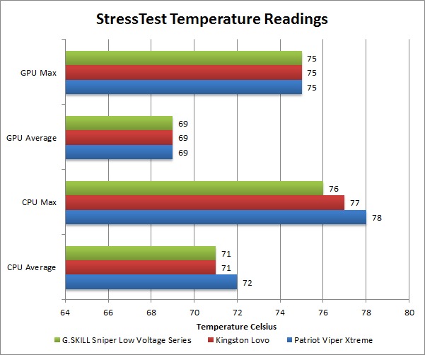 Since we now know that low voltage RAM has a measurable impact of system power draw, it stands to reason that low voltage RAM should also run at a lower temperature. The question now is if the lower voltage will also cause lower CPU or GPU temperatures, or if it will only affect the RAM sticks themselves. First, let's look at the CPU and GPU temperature readings we recorded during our 10 minute stresstest: