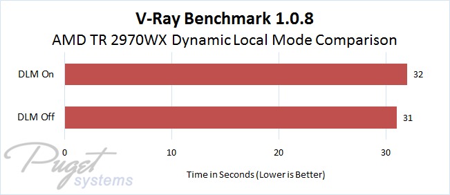 DLM Off took a slight lead in V-Ray, but I would consider this within the margin of error. Across three runs, all three came back at 32 seconds with DLM On and two came back with 32 and one with 31 seconds when DLM was turned Off. I am sticking to our official approach to listing the results, as described previously, but I really don't think DLM is having any true impact here.