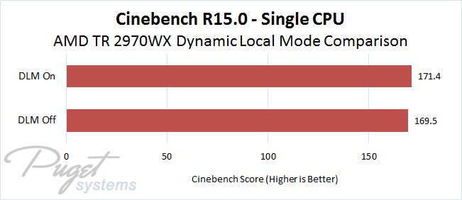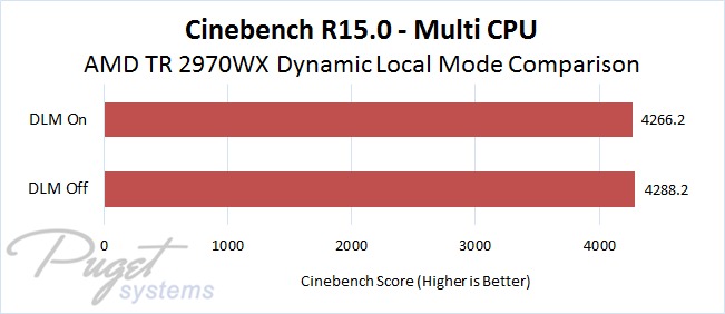 AMD's Dynamic Local Mode makes very little performance difference in CPU-based rendering applications, and that shouldn't be a big surprise. The main goal of DLM is to improve performance in situations where not all of the CPU's cores are active, by prioritizing thread placement on cores which have direct access to system memory, but CPU-based rendering does a good job of utilizing all available cores. Even in the case of Cinebench's single CPU test, which is more reflective of 3D modeling and animation performance, since only a single core is used there isn't much impact there either.