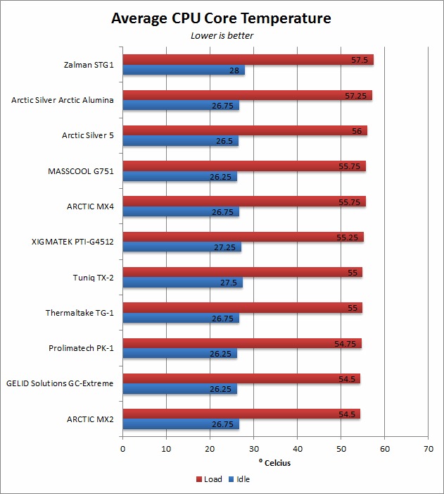 Thermal testing is about as straight-forward as it gets when it comes to PC testing. The only thing to remember is that load results are much, much more important than idle results. So, based on the load results, we can determine that the ARCTIC MX2 and the GELID Solutions GC-Extreme are the best performing thermal pastes out of those we tested. However, the Prolimatech PK-1, Thermaltake TG-1, and Tuniq TX-2 are only .5 °C behind which is within our margin of error.