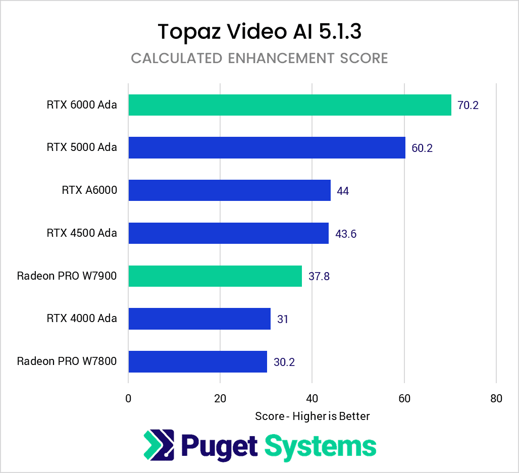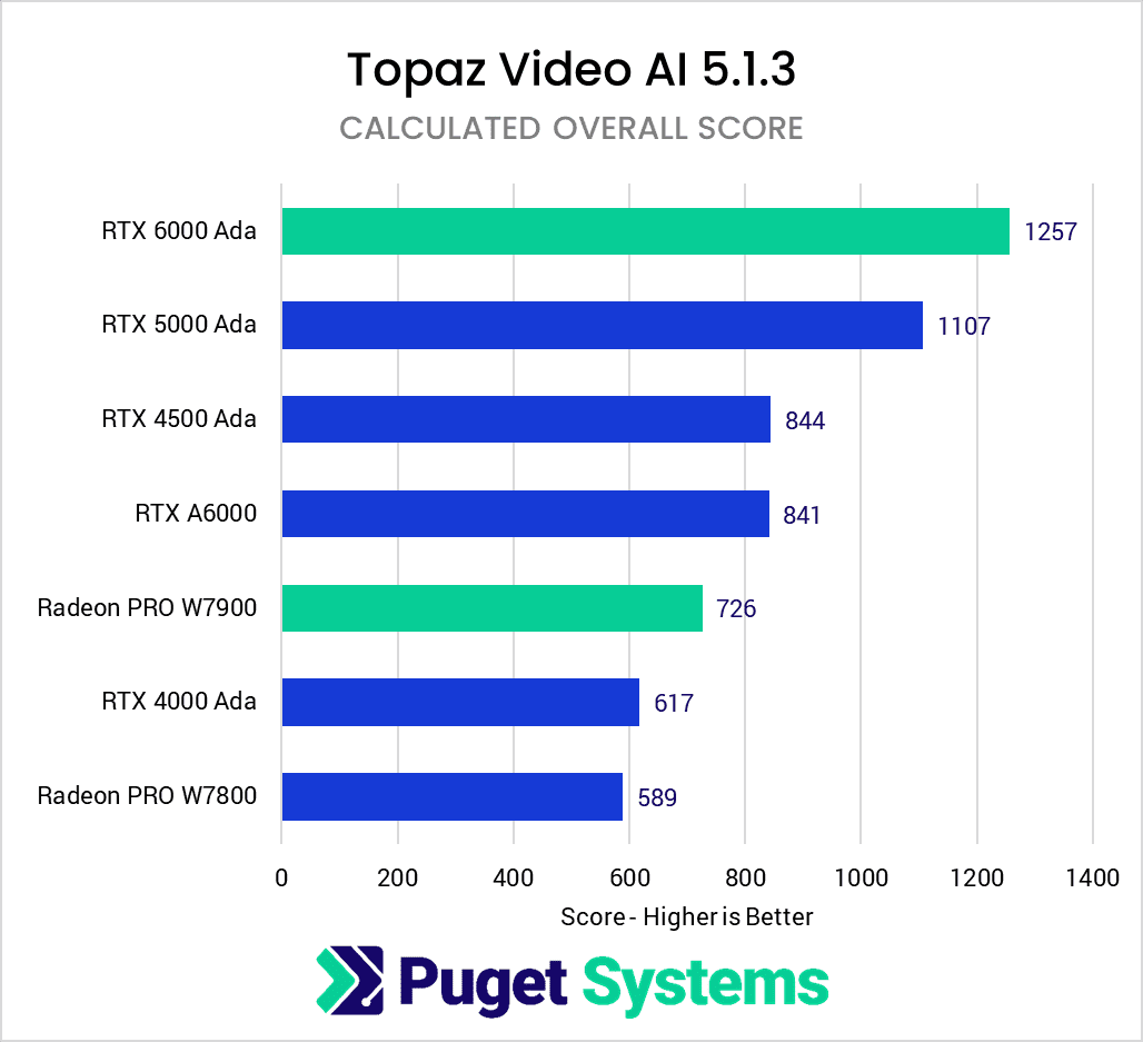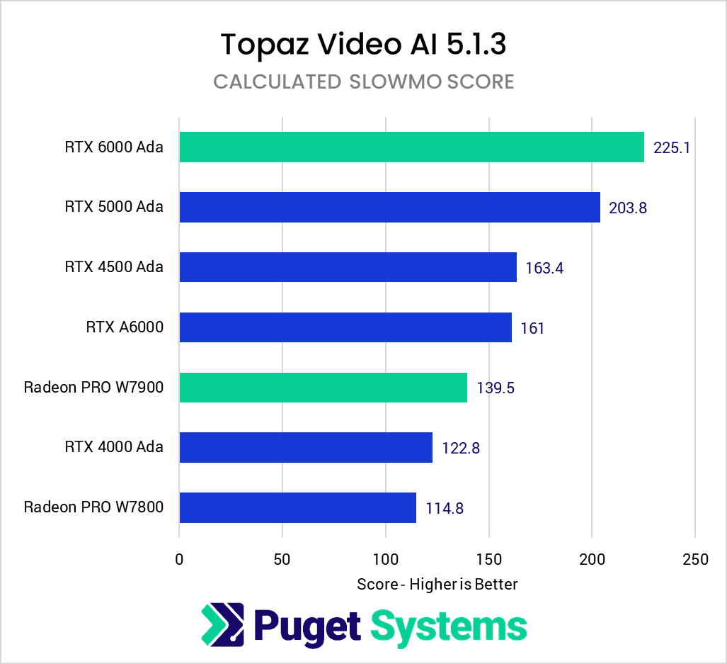 In general, if you are looking for a professional GPU for Topaz Video AI, NVIDIA RTX is definitely the way to go. It is very important to use the latest Ada-generation cards, as they provide a massive boost over the previous-generation A-series cards, but whatever card fits your budget within that generation will do very well in Topaz Video AI.