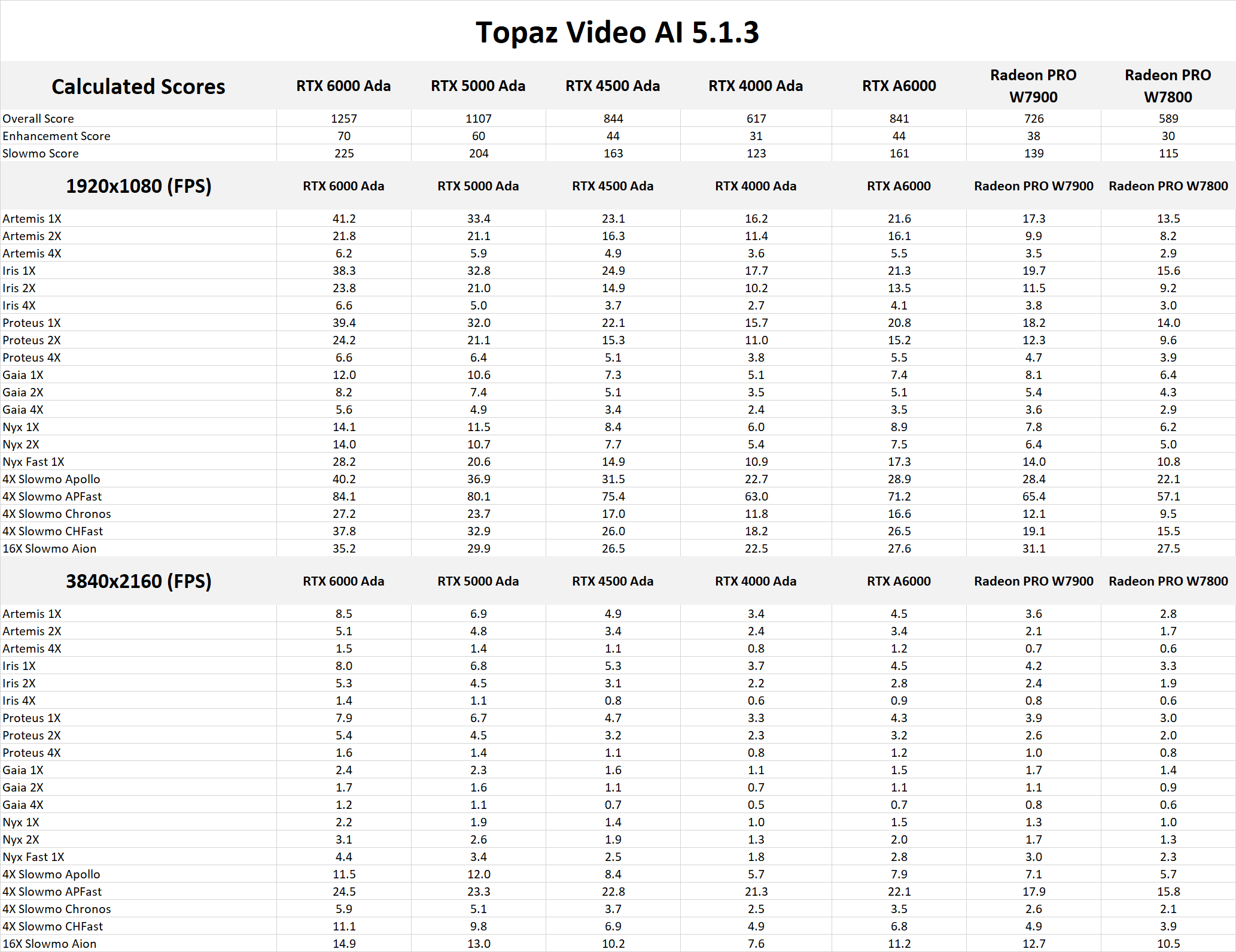 Firstly, the RTX 6000 Ada tops the performance charts, giving NVIDIA the overall top spot. But the RTX 5000 Ada also beats the similarly priced Radeon PRO W7900 by a pretty large 50%. The NVIDIA RTX GPUs are not any stronger than their GeForce counterparts (and are, in fact, slightly slower due to their more conservative clock speeds), but the Radeon PRO cards, for some reason, perform noticeably below their Radeon counterparts. Most likely, this is due to some sort of driver issue, although if so, it is something specific to Topaz Video AI, as the Radeon PRO and Radeon cards performed as expected in our recent consumer and professional GPU testing for DaVinci Resolve.